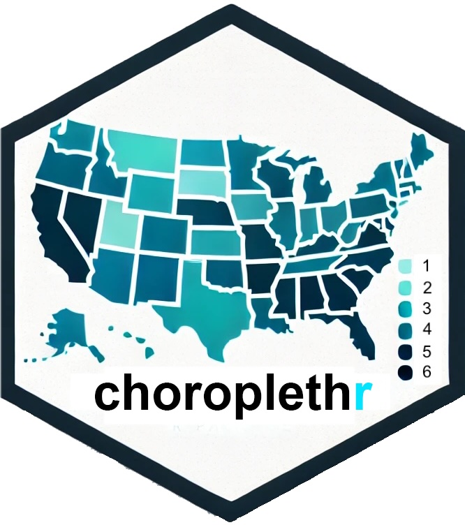 remotes::install_github('ropensci/rnaturalearthhires')Version 5 of the package contains many new changes to improve the appearance and customization of the maps produced; some of these changes are not backwards compatible with previous versions of choroplethr. If you need everything to work in exactly the same manner as before, please follow these instructions to install the previous versions of choroplethr from the CRAN archive: