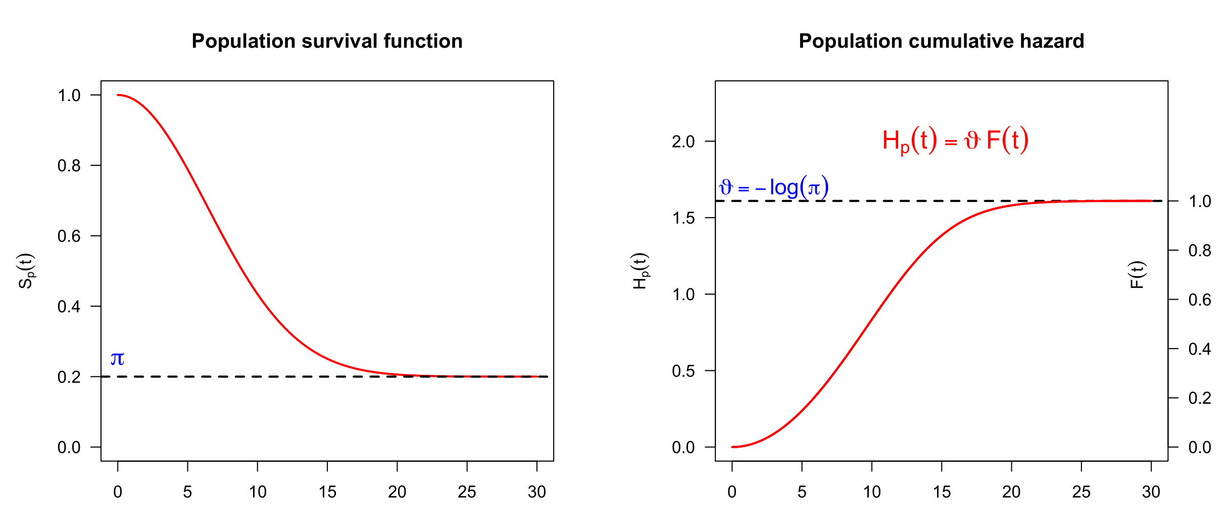 The starting point is the bounded cumulative hazard model (also name the promotion time model) (Tsodikov 1998) with population survival function \[S_p(t|\mathbf{v}) = \exp\{-H_p(t|\mathbf{v})\} =\exp\{-{\vartheta(\mathbf{v})} F(t)\},\] bounded hazard \(H_p(t|\mathbf{v})\) and cure fraction \(\pi(\mathbf{v})=S_p(+\infty|\mathbf{v})=\exp\{-{\vartheta(\mathbf{v})}\}\), see Figure 1. Function \(F(t)\) is a c.d.f. governing the population hazard dynamics, with \(F(0)=1\) and \(F(T)=1\) where \(T\) is the minimum value of time after which an event-free unit is considered cured.